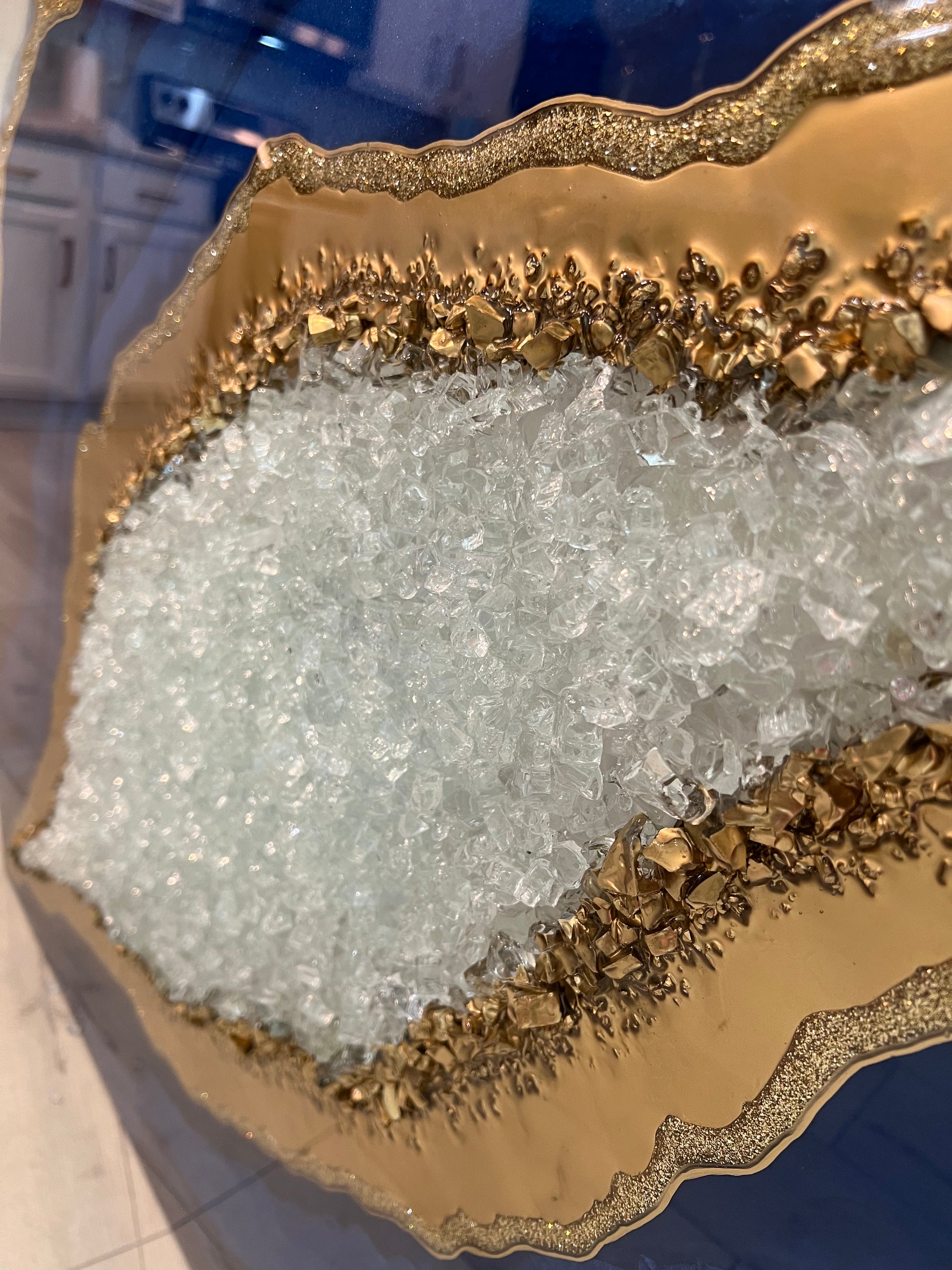 This 37x49 bold and gorgeous piece has a striking glass centerpiece and gold sparkles that pictures just cannot capture!