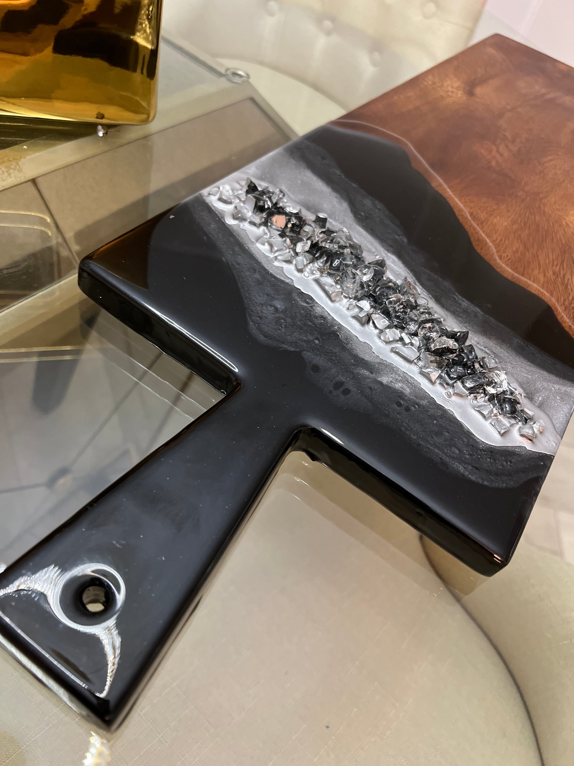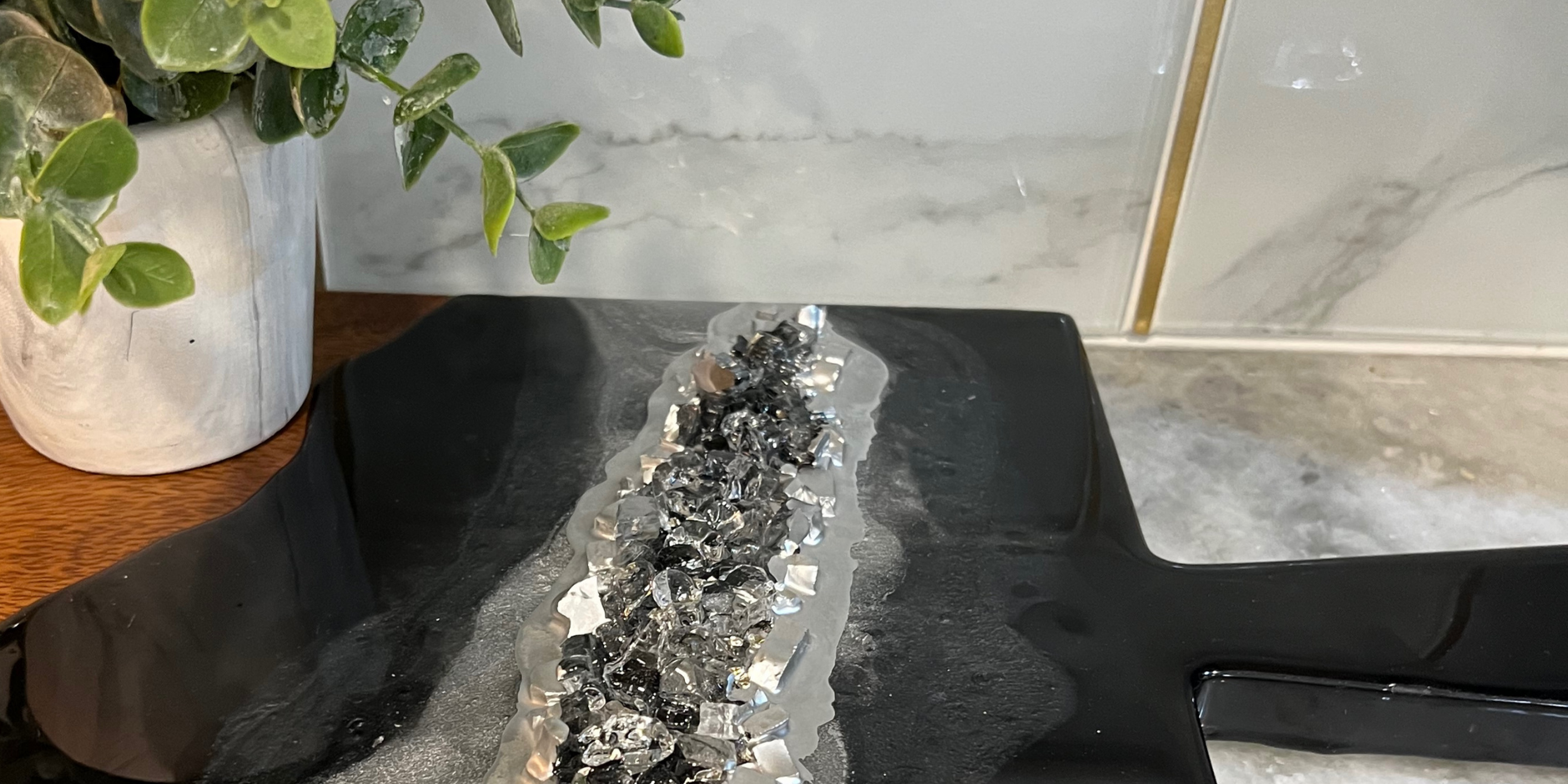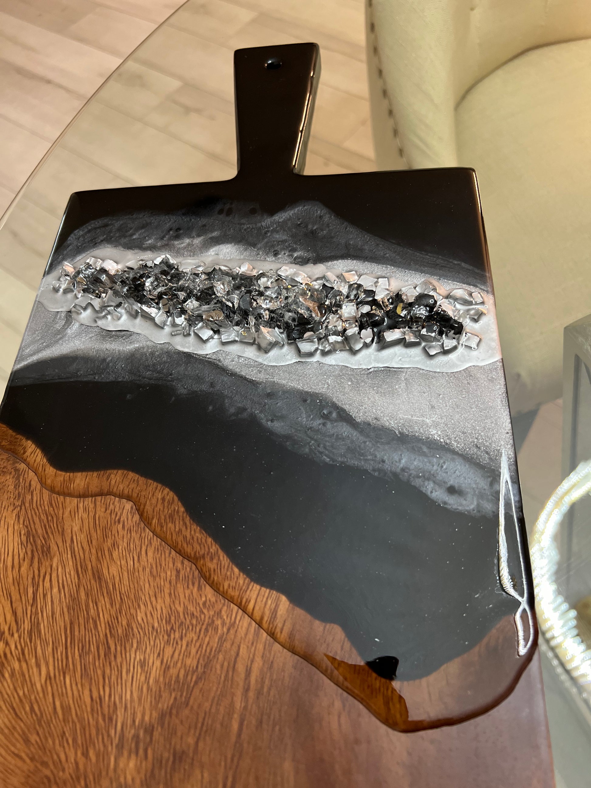 This Black Geode inspired Charcuterie Board can be used for styling or hosting! Board comes treated with a food safe oil that not only conditions but is also safe for food.