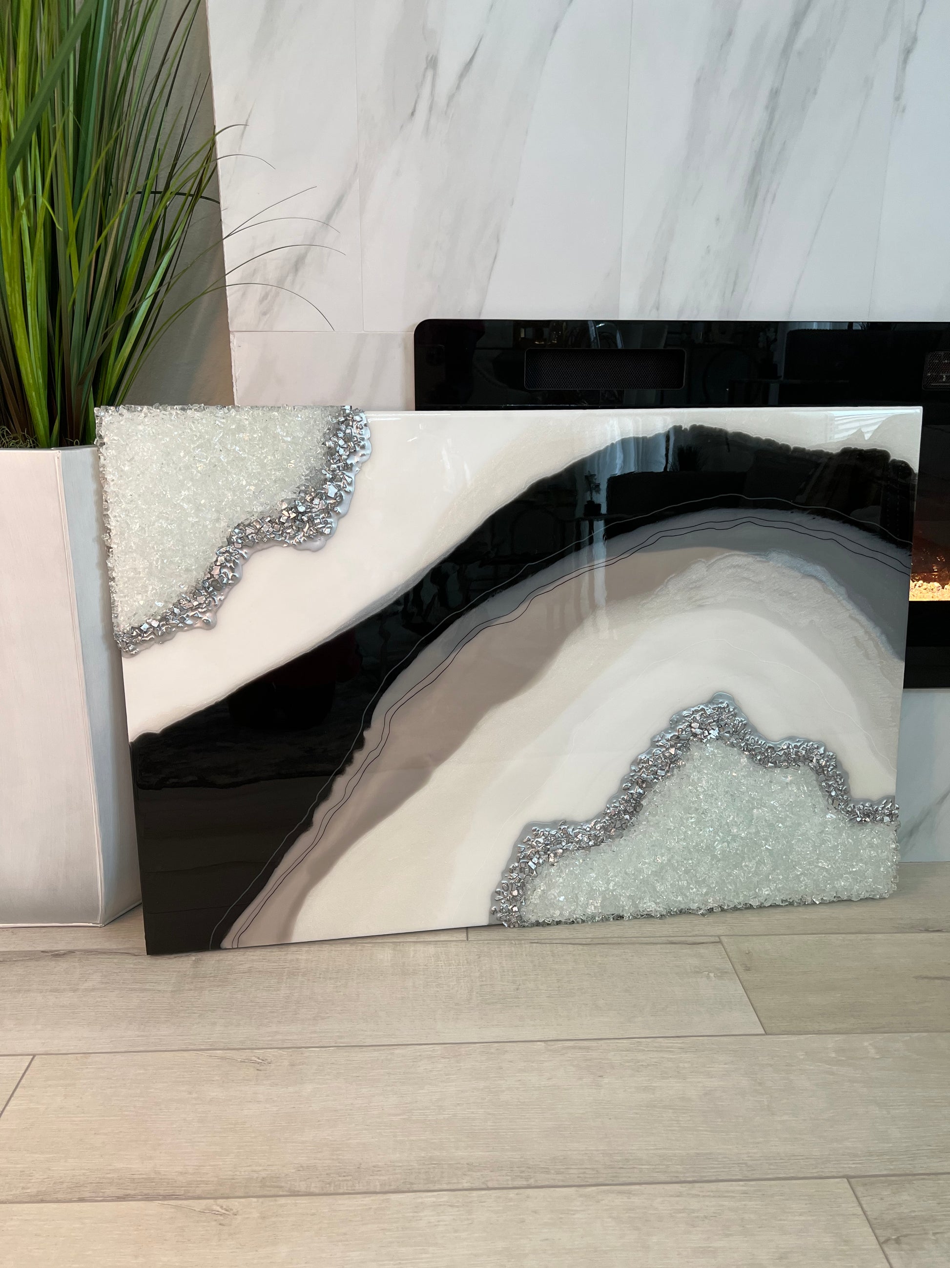 A silver vibe! This 25x36 piece is perfect for a man cave but can hold its own in a room full of glam as well!
